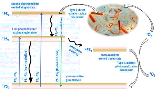 In the aPDT approach, absorbed light energy is always used for bactericidal or bacteriostatic impact through two key molecular photosensitizer-mediated mechanisms. While the type I mechanism is based on radical-forming hydrogen transfer from a light energized photosensitizer directly to biomolecules, the type II mechanism involves an initial photosensitization of oxygen to produce reactive oxygen species, which in turn attack biomolecules [56]. The mechanistic basics of type I and type II may be illustrated using a Jablonski diagram as shown in Figure 1, showing the direct and the reactive oxygen species mediated pathways. Studies have shown that both mechanisms cause irreversible chemical reactions that alter the functionality of biomolecules and disrupt their environment [57], regardless of whether these biomolecules are cellular, EPS matrix components or other functional constituents of the biofilm [58]. These studies showed that aPDT is not prevented by the biofilm from achieving an increase in intracellular reactive oxygen species. At the same time, several studies have focused on the impact of aPDT on the biofilm matrix strength and constituent pathogen metabolic activity [59,60]. For example, bacterial pathogen reduction and eradication was found to be accompanied by reactive oxygen- induced oxidative stress, biofilm matrix weakening, loss of adhesion and component changes [61].