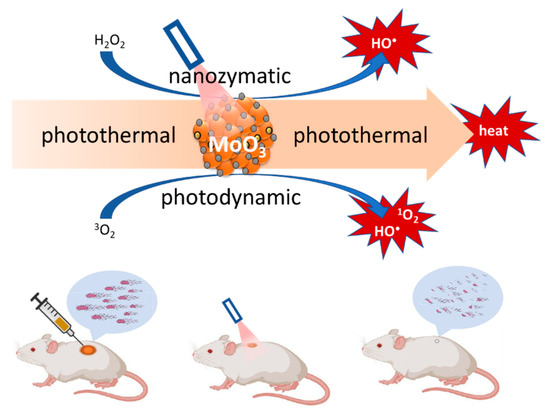 Illustration of the triple therapy combination of PTT, PDT, and nanozyme effect of molybdenum trioxide nanoparticles.