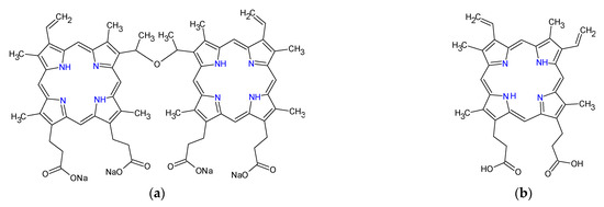 Chemical structures of sinoporphyrin sodium (a) and protoporphyrin IX (b).