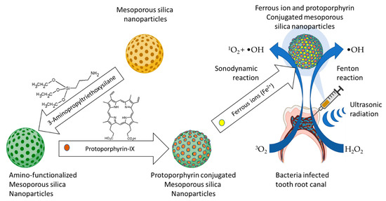 - Guo, J.; Xu, Y.; Liu, M.; Yu, J.; Yang, H.; Lei, W.; Huang, C. An MSN-based synergistic nanoplatform for root canal biofilm eradication via Fenton-enhanced sonodynamic therapy. J. Mater. Chem. B 2021, 9, 7686–7697. [Google Scholar] [CrossRef]