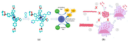 The self-assembly nanozyme formation mechanism and the planktonic bacterial cell aggregation mechanism leading to photodynamic bacterial cell death and biofilm structure destruction. (a) Bipyridine mediated self-assembly of the porphyrins to form the porphyrin nanozyme with peroxidase/catalase mimic activities. (b) Planktonic cell aggregation mechanism reported by Hu et al. (2022) [163]. (1) planktonic microbial form, (2) surface adhesion, (3) colony formation and maturation, (4) biofilm formation, (5) microbial detachment from biofilm.