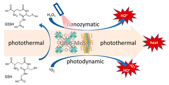 Nanozyme, photothermal, photodynamic, and glutathione oxidation activity of molybdenum disulfide sheet conjugated UIO-66 metal-organic-framework [167].
