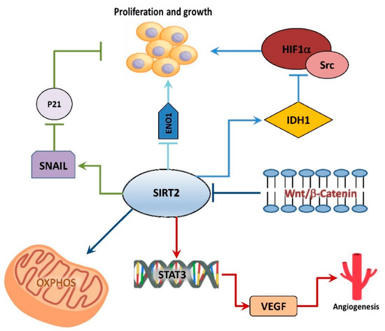 SIRT2 acts both as tumor suppressor and tumor promoter, inhibiting tumor proliferation but also promoting tumor survival and the angiogenetic process. HIF1α, Hypoxia inducible factor 1α; IDH1, Isocitrate dehydrogenase 1; STAT3, signal transducer and activator of transcription 3; VEGFA, vascular endothelial growth factor A; ENO1, α-enolase.