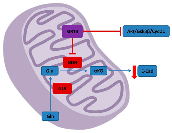 The activity of SIRT4 in CRC is still relatively unknown. However, many findings point out the tumor suppressor role of this mitochondrial SIRT able to counter the gaining of malignant properties from cancerous cells, underlining that SIRT4 expression is lower in CRC compared to normal tissue [121]. SIRT4 activity affects glutamine metabolism repressing the activity of glutamate dehydrogenase (GDH) and abrogating alpha-ketoglutarate (αKG) formation (Figure 3) [122]. The SIRT4-mediated upregulation of E-cadherin and downregulation of proteins associated to cellular mobility and metastasis make this protein a valuable prognostic biomarker in CRC patients [123]. Indeed, low SIRT4 expression is related to worse prognosis and aggressiveness of CRC [124]. SIRT4 expression also influences the response of CRC to chemotherapy. It has been observed that SIRT4 activity can be determinant in defining the apoptosis induced by 5-fluorouracil (5-FU), one of the most used drugs in colorectal cancer therapies [125,126]. The suppression of SIRT4 promotes glutaminase (GLS) activity, thereby initiating the activation of protein kinase B (AKT). In CRC, SIRT4 inhibits proliferation, migration, and invasion regulating the AKT/glycogen synthase kinase 3β (GSK3β)/CyclinD1 pathway (Figure 3) [127].