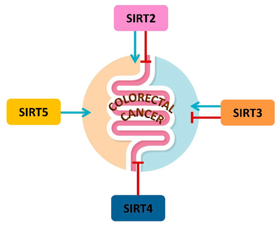 Mitochondrial SIRTs, SIRT2, SIRT3, SIRT4 and SIRT5, exert different effects on CRC initiation, promotion and progression. The blue arrows stand for an oncogenic activity, while the red ones indicate a tumor suppressive role. SIRT2 and SIRT3 exert a multifaceted activity on CRC, SIRT4 is mainly a tumor suppressor while SIRT5 is mainly a tumor promoter.