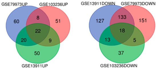 Venn diagrams of upregulated and downregulated genes in all three GC microarray datasets.
