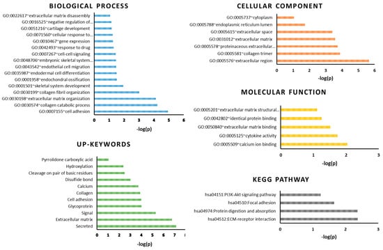 The main pathways involved were ECM (extracellular matrix)–receptor interaction, protein digestion, focal adhesion, and PI3K-Akt signaling. The main terms that appeared during analysis were secretion, ECM, cell adhesion, and collagen.