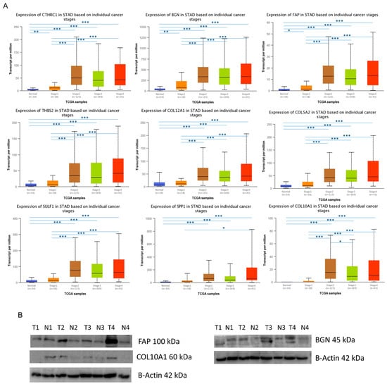 The expression levels of hub genes in GC. (A) The mRNA expression was correlated with pathological T stages. The asterisk represents the comparison between a specific stage and the normal group, or between different stages. * p < 0.05, ** p < 0.01, *** p < 0.001. (B) Representative western blotting for COL10A1, BGN, and FAP proteins in 4 paired gastric tumor (T) and adjacent non-tumor tissues (N) with progressive stages from T1 to T4.