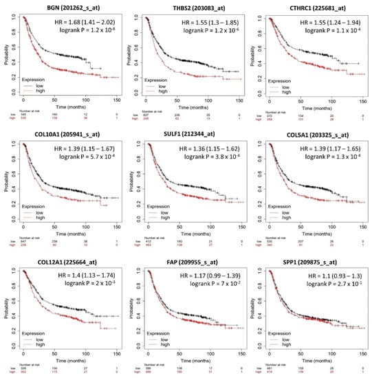 Collagen fibers and matrix remodeling enzyme correlation with tumor aggression and immune infiltrate can be exploited to predict cancer patient outcome. Kaplan–Meier analysis revealed a significant correlation between the high expression of BGN (p = 1.2 × 108), COL5A1 (p = 1.3 × 104), COL10A1 (p = 5.7 × 104), COL12A1 (p = 2 × 103), CTHRC1 (p = 1.1 × 104), SULF1 (p = 3.8 × 104), and THBS2 (1.2 × 106) and poor overall survival.