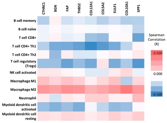 TIMER2.0 (https://cistrome.shinyapps.io/timer/; access date 17 January 2022) [] was used to analyze the relationship between the hub genes and 12 immune cell types in the tumor microenvironment. A heat map with Spearman’s rho was generated presenting the correlation of the expression of selected genes with various immune cells in GC.