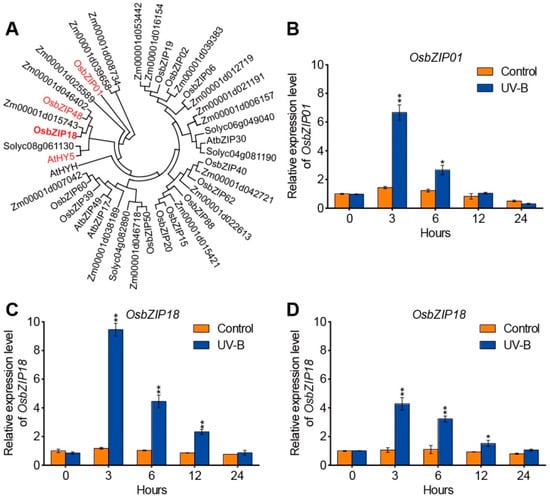 2.2. UV-B Radiation Alters the Expression Levels of OsbZIP01, OsbZIP18, and OsbZIP48 in Rice