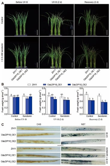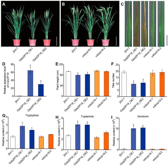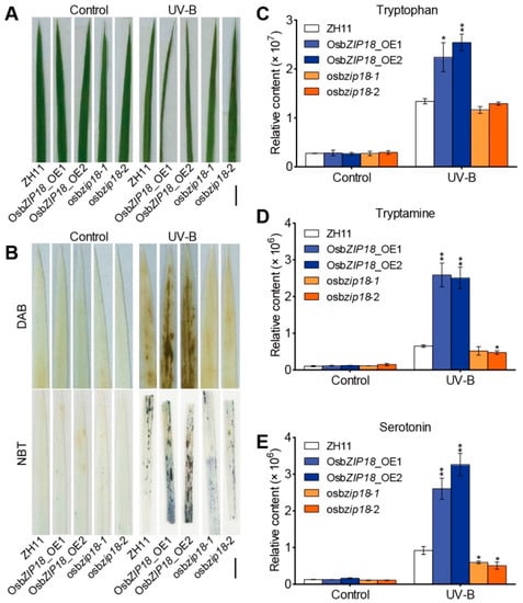 Sun, Y.; Wang, B.; Ren, J.; Zhou, Y.; Han, Y.; Niu, S.; Zhang, Y.; Shi, Y.; Zhou, J.; Yang, C.; et al. OsbZIP18, a Positive Regulator of Serotonin Biosynthesis, Negatively Controls the UV-B Tolerance in Rice. Int. J. Mol. Sci. 2022, 23, 3215. https://doi.org/10.3390/ijms23063215