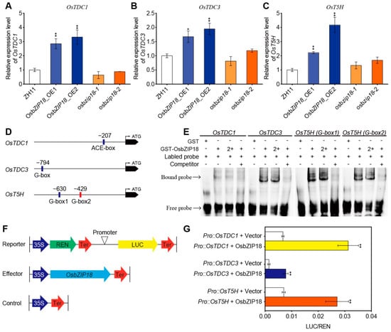 2.4. OsbZIP18 Directly Binds to the Promoter of Serotonin Biosynthesis Genes OsTDC1, OsTDC3, and OsT5H