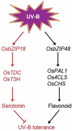 Sun Y, Wang B, Ren J, Zhou Y, Han Y, Niu S, Zhang Y, Shi Y, Zhou J, Yang C, et al. OsbZIP18, a Positive Regulator of Serotonin Biosynthesis, Negatively Controls the UV-B Tolerance in Rice. International Journal of Molecular Sciences. 2022; 23(6):3215. https://doi.org/10.3390/ijms23063215