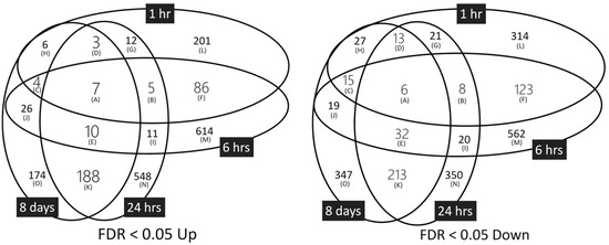 - Breitling, R.; Armengaud, P.; Amtmann, A.; Herzyk, P. Rank products: A simple, yet powerful, new method to detect differentially regulated genes in replicated microarray experiments. FEBS Lett. 2004, 573, 83–92. [Google Scholar] [CrossRef]