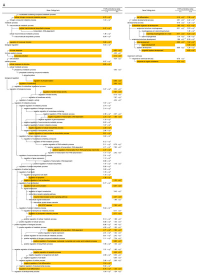 The selected probe sets were functionally classified according to the biological process in Gene Ontology with the functional annotation tool DAVID [83,84] version 6.7. The probe set IDs provided by Affymetrix were used as the input data. For the gene-list manager on the DAVID website (http://david.abcc.ncifcrf.gov/, accessed on 21 February 2015), we selected the species option to limit the annotations exclusively to Mus musculus. For the population manager option, the mouse genome 430_2 platform was selected as the background. The functional annotation chart was analyzed based on biological processes in GO, GOTERM_BP_ALL. To extract the statistically over-represented GO terms in each group of differentially expressed genes and to correct the results by multiple testing, we used EASE scores to modify Fisher’s exact test p-values [85] and Benjamini and Hochberg FDR corrections [86]. A Benjamini and Hochberg FDR-corrected p-value < 0.01 indicated a significantly enriched GO term. To recognize the hierarchical structure of the selected GO terms, we used Quick GO (https://www.ebi.ac.uk/QuickGO/, accessed on 21 February 2015), an online analysis tool.