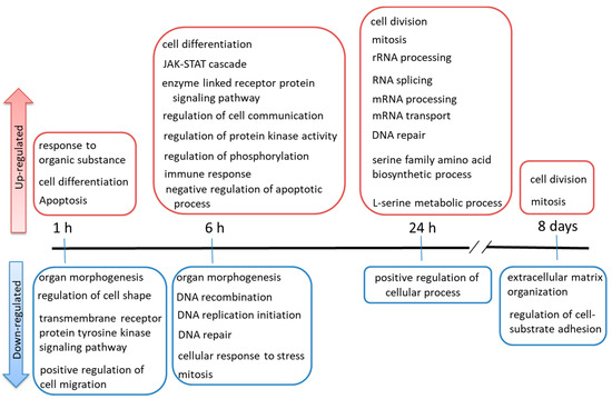 To identify GO terms that were over-represented among the selected genes, we used the online software Database for Annotation, Visualization, and Integrated Discovery (DAVID). Among the up-regulated genes, several GO terms common between the 1 and 6 h TPA treatments were not significantly enriched in the other treatment groups (Figure 3A). The GO terms that were common among the genes that were up-regulated by TPA treatment for 1 or 6 h were as follows: negative regulation of transcription DNA-dependent, positive regulation of transcription DNA-dependent, regulation of cell differentiation, cell differentiation, multicellular organism at development, branching morphogenesis of a tube, and tube development. The GO terms that were only significantly enriched in the group treated with TPA for 1 h consisted of regulation of apoptosis, cellular response to stimulus, response to organic substance, and negative regulation of cell differentiation. Those significantly enriched only in the group treated with TPA for 6 h were immune response, regulation of phosphorylation, regulation of protein kinase activity, enzyme-linked receptor protein signaling pathway, regulation of cell communication, JAK-STAT cascade, regulation of phosphate metabolic process, and nucleotide and nucleic acid metabolic process. The GO terms that were common between the genes that were up-regulated after TPA treatment for 24 h and 8 days (Figure 3B) were cell division and mitosis. The GO terms that were only significantly enriched in the group treated with TPA for 24 h were translational initiation, cell cycle checkpoint, and interphase of mitotic cell cycle. Moreover, all the GO terms associated with TPA treatment for 8 days were included among those related to TPA treatment for 24 h. The GO terms significantly enriched among the gene sets that were down-regulated by TPA treatments of different durations are summarized in Figure S4—they were not significantly involved in cancer. These are summarized in chronological order in Figure 4.