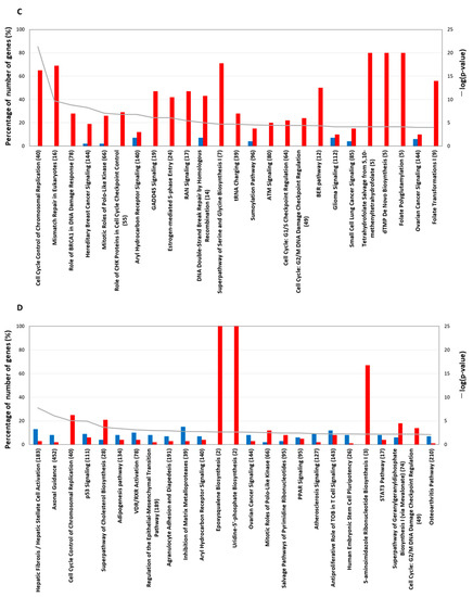 The top-25 canonical pathways. TPA treatment for (A) 1 h and (B) 6 h. The line graph shows a list of genes whose expression increased or decreased at each treatment time and the −log value (p-value) obtained by testing a list of genes of the canonical pathway via Fisher’s exact test. The bar graph shows the rate (%) of the number of genes that were up-regulated (red) and the number of genes that were down-regulated (blue) when the number of genes in a known pathway was 100%. The top-25 canonical pathways (continued). TPA treatment for (C) 24 h and (D) 8 days. Other explanations are the same as for the graphs of the 1 h treatment and the 6 h treatment.