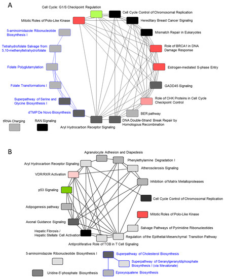 Overlapping of the top-25 canonical pathways. TPA treatment for (A) 24 h and (B) 8 days. The color of the pathway is red when the z-score is larger than 0, and greenish when it is below 0. When the z-score is 0, the color is distinguished by the brightness of the monotone according to the value of the −log (p-value). Common genes among the respective pathways are connected by lines. The pathway connected by the blue line in (A) is the pathway of folate metabolism. The pathway connected by the blue line in (B) is the pathway for the biosynthesis of cholesterol.