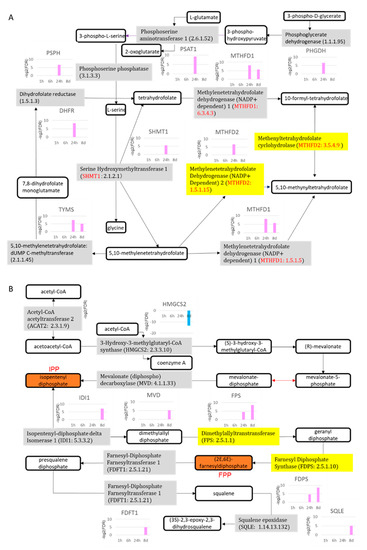 Overlapping the canonical pathways within the top-25 according to −log (p-value) yielded a cluster comprising five pathways that were classified as the “synthesis of folic acid and nucleic acid” group: superpathway of serine and glycine biosynthesis I, tetrahydrofolate salvage from 5,10-methenyltetrahydrofolate, dTMP de novo biosynthesis, folate polyglutamylation, and folate transformations I, the last of which formed a separate cluster from the other 20 pathways (Figure 6A). The gene expression of all 10 enzymes related to the metabolites of folate shown in Figure 7A was increased. The gene expression of 5,10-methylenetetrahydrofolate (1.5.1.15) and 5,10-methenyltetrahydrofolate (3.5.4.9) 5-hydrolase, named methylenetetrahydrofolate dehydrogenase 2 (MTHFD2), was increased in the pathway folate transformations, I.