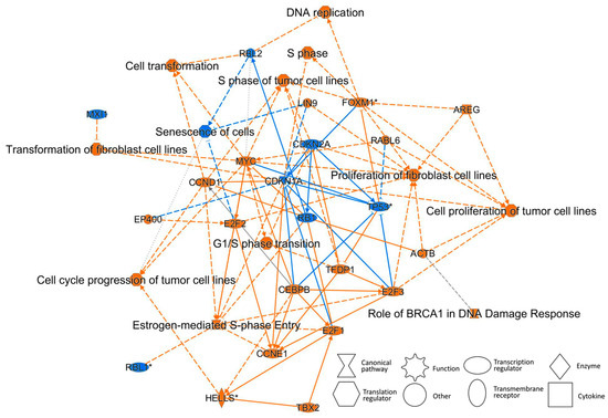Graphical summary of the molecule and its function following treatment with TPA for 24 h. Graphical summary was analyzed using IPA software. The activated molecule or function has a positive z-score and is therefore orange. The suppressed molecule or function has a negative z-score and is therefore blue. Estimated edges are shown as dotted lines (not solid lines).