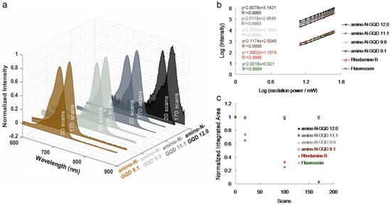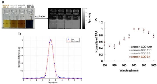 Figure 2a shows the TPL spectra of the increase in the size of the sorted amino-N-GQDs, indicating red-shifted peaks of amino-N-GQD 9.1, amino-N-GQD 9.9, amino-N-GQD 11.1, and amino-N-GQD 12.0 at approximately 719, 772, 810, and 862 nm, respectively, in the NIR region under TPE (power: 222.7 nJ pixel