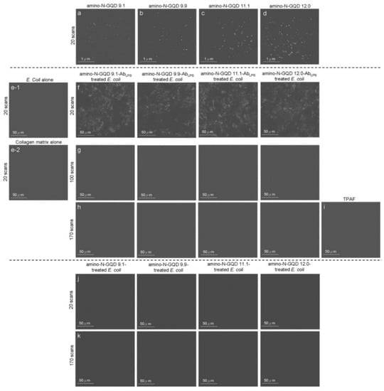 Figure 4b) was observed on the surface of the bacteria. In contrast, when the GQD size was increased using amino-N-GQD 9.1, amino-N-GQD 9.9, amino-N-GQD11.1, and amino-N-GQD12.0, a high fluorescence QY and large cross-section was detected in the TPL images (