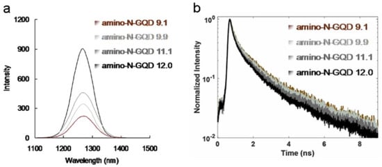 Table 2). The results indicated that the material passed mainly through the radiative pathway as the fluorescence QY increased (amino-N-GQD 9.1: 0.39; amino-N-GQD 9.9: 0.41; amino-N-GQD 11.1: 0.45; and amino-N-GQD 12.0: 0.48) and the lifetime decreased (from 1.13 to 0.93 ns;