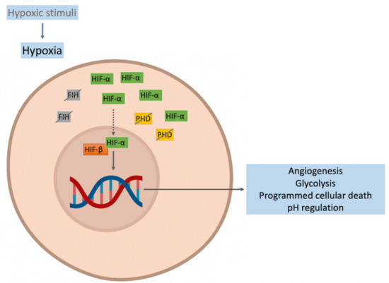 Hypoxia is a condition in which cell function in limited by deprivation of adequate oxygen concentration. The cellular hypoxic response is initiated by hypoxic stimuli such as low oxygen pressure, poor oxygen diffusion-perfusion, among others, and is mediated by hypoxia-inducible factors (HIF). HIF consists of two subunits: an HIF-α subunit (oxygen-sensitive) and a constitutively expressed unit, HIF-β [28,29]. In normoxia, HIF-α is hydroxylated by prolyl hydroxylase domain isoforms (PHDs) and is then polyubiquitinated by the von Hippel-Lindau (VHL) protein for proteasomal degradation. In normoxia, factor-inhibiting hypoxia (FIH) hydroxylates HIF-α, inhibiting its transcriptional capacity [30,31]. In hypoxia, the activity of PHD and FIH are reduced, leading to the accumulation of HIF-α and its translocation to the nucleus. In the nucleus, the heterodimer HIF-α/HIF-β is formed and forms a complex with the cAMP response element-binding (CREB), the binding protein (CBP1), and histone acetyltransferase p300. This complex binds to the hypoxia response elements (HRE) of HIF target genes to activate the expression of more than 200 genes, initiating the stimulation of several cellular pathways aimed at survival in a hypoxic environment [29,32]. The principal pathways activated by HIF-α are angiogenesis, glycolysis, programmed cellular death, and pH regulation to enhance the oxygen in the cells by increasing the concentration of the oxygen transporter (hemoglobin) by EPO or the oxygen flow by activating the sympathetic system [33,34] (Figure 1).