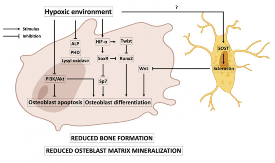 It has been reported that osteoblast activity may decrease in low oxygen environments. In this line, it has been shown that osteoblasts cultured in a 2% oxygen environment decreased their bone formation activity 10-fold. The hypoxic environment delayed the growth and differentiation of osteoblasts [38], and osteoblastogenesis was suppressed in short-term exposure of rats to hypoxia [39]. Figure 2 shows the main events that occur in osteoblasts in hypoxia. Hypoxia could be associated with reduced Runx2 expression, causing a reduction in the differentiation of immature osteoblasts from multipotent mesenchymal cell differentiation [40,41]. The reduced Runx2 could be caused by the expression of Twist that is activated by HIF-1α [42]. In addition, HIF-2α impairs osteoblast differentiation by upregulating Sox9, which inhibits the expression of Runx2 and Sp7, factors involved in osteoblast differentiation [43]. Hypoxia has been associated with inhibition of the phosphatidylinositol 3-kinase (PI3K)/Akt pathway, which plays an important role in anti-apoptotic and survival signals in osteoblasts [44]. Hypoxia could also inhibit osteoblastogenesis, as it may increase induced SOST gene expression and therefore increase the expression of sclerostin in the osteocytes [45]. This is a controversial idea; it is also reported that hypoxia decreases sclerostin expression [46]. Hypoxia is also associated with inhibition of osteoblast matrix mineralization. In the matrix, mineralization is crucial in a series of post-translational modifications of collagen carried out by the PHD and lysyl oxidase oxygen-dependent enzymes, and these enzymes are reduced in hypoxia [38,47]. It has been reported that hypoxia reduces the expression and activity of alkaline phosphatase (ALP) [38].