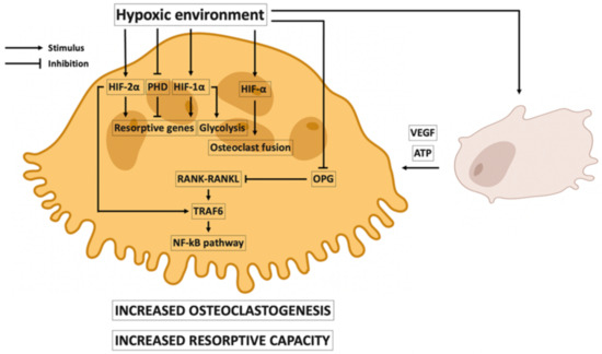 Hypoxia also promotes osteoclastogenesis: HIF-1α and HIF-2α have been associated with increased expression of osteoclast-fusion-related genes, accelerating osteoclast cell fusion [52,54]. Hypoxia has been associated with a suppression of OPG, which favors the RANK–RANKL interaction and the NF-κB pathway [55,56]. TRAF6 is an adapter of RANK, promoting osteoclastogenesis [57], and HIF-2α may upregulate the expression of TRAF6 [54]. Osteoblast–osteoclast crosstalk plays an important role in the response to osteoclasts during hypoxia. VEGF (synthesized by osteoblasts during hypoxia) increases the resorptive activity of osteoclasts [48], which are stimulated by ATP, which is released by osteoblasts in a hypoxic environment [39].