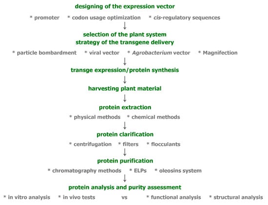 The process of developing the production of a specific therapeutic protein in any system (including crop plants) consists of several stages, each being extremely complex. First, a particular protein with the desired therapeutic activity should be selected and subjected to very precise molecular analysis. This knowledge will form the basis of optimizing the expression of this protein in the selected plant system and even in a specific cell compartment. The next step is to introduce the gene encoding the desired protein into the recipient’s genome, using the appropriate transformation method and host organism (here, the plant). It should be emphasized that it is also indispensable to estimate the expected costs of obtaining a protein product based on the work with the prototype host [].