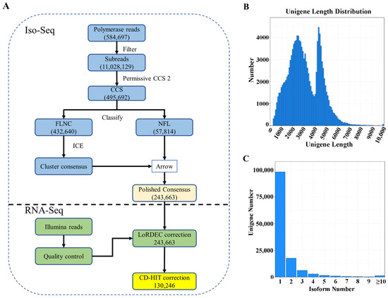 Data processing (A) and summary statistics of the unigenes obtained by PacBio Iso-Seq (B,C). (A) overview of the data process; (B) length distribution of unigenes; (C) isoform number.