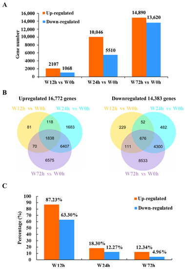The numbers of up- and down-regulated DEGs between the control (0 h of waterlogging) and waterlogging treatments increased gradually over time (Figure 2A). There were 1838 and 676 commonly up- and down-regulated DEGs, respectively, among different periods of waterlogging stress (Figure 2B). Additionally, 310 (81 up- and 229 down-regulated), 2165 (1683 up- and 482 down-regulated) and 15,108 (6575 up- and 8533 down-regulated) DEGs were specifically expressed after 12, 24 and 72 h of waterlogging, respectively. The percentages of co-expressed upregulated and downregulated DEGs were highest after 12 h of waterlogging (Figure 2C). These results indicated that a conserved transcript adjustment was stimulated at as early as 12 h of waterlogging and dynamic transcriptomic changes were induced after 24 or 72 h of waterlogging stress in KR5 roots.