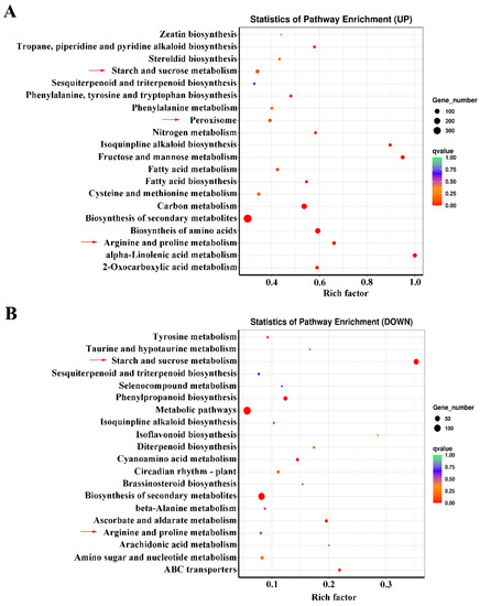 In a KEGG pathway enrichment analysis of co-expressed up-regulated DEGs, the most significant pathways included ‘starch and sucrose metabolism’, ‘fructose and mannose metabolism’, ‘arginine and proline metabolism’, ‘biosynthesis of amino acid’, ‘nitrogen metabolism’, and ‘peroxisome’ (Figure 3A). For the co-expressed down-regulated DEGs, the ‘starch and sucrose metabolism’, ‘arginine and proline metabolism’, and ‘beta-alanine metabolism’ pathways were significantly enriched (Figure 3B). These results showed that the responses of KR5 roots to different durations of waterlogging stress mainly involved the regulation of carbohydrate and amino acid metabolisms and ROS scavenging.