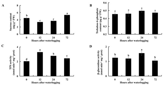 Changes in sucrose (A) and T6P (B) contents, as well as TPS (C) and β-glucosidase (D) activity in KR5 roots under waterlogging stress. Data are expressed as averages ± SD, n = 3. Significant differences between treatments at p < 0.05 are indicated by different letters over columns (Duncan’s test).