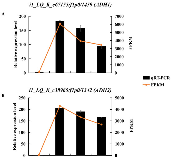 Changes of expression levels of two DEGs encoding ADH and ADH activity in KR5 roots under waterlogging stress. (A) RNA-Seq (right vertical axis) and qRT-PCR (left vertical axis) results for transcript changes in i1_LQ_K_c67155/f1p0/1459 (ADH1); (B) RNA-Seq (right vertical axis) and qRT-PCR (left vertical axis) results for transcript changes in i1_LQ_K_c38965/f1p0/1342 (ADH2); (C) ADH activity. In (C) data are expressed as averages ± SD, n = 3 and significant differences between treatments at p < 0.05 are indicated by different letters over columns (Duncan’s test).