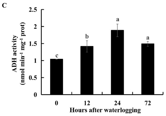 ADH is a marker of anaerobic fermentation. Transcript levels of DEGs encoding ADHs were upregulated in KR5 roots under waterlogging stress (Figure S5). RNA-Seq results showed that the expression levels of i1_LQ_K_c67155/f1p0/1459 (ADH1) and i1_LQ_K_c38965/f1p0/1342 (ADH2) were most significantly upregulated under waterlogging stress (Figure 6A,B and Figure S5). The upregulation of these two ADHs under waterlogging stress was validated by qRT-PCR (Figure 6A,B). ADH activity was significantly higher under waterlogging stress than in the controls (p < 0.05, Figure 6C). These results indicated that ethanolic fermentation was activated in KR5 roots under waterlogging stress.