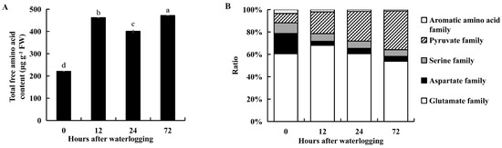 Changes of the total free amino acid content (A) and the proportion of different amino acid family (B) in KR5 roots under waterlogging stress. In (A) the total free amino acid content was estimated as the sum of the contents of 16 individual free amino acids. Data are expressed as averages ± SD, n = 3. Significant differences between treatments at p < 0.05 are indicated by different letters over columns (Duncan’s test).
