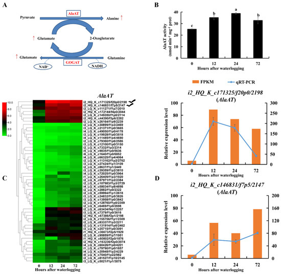 There was a 14-fold increase in the amount of free alanine in roots after 12 h of waterlogging compared to levels in the controls (Table S3). AlaAT catalyzes the formation of alanine by consuming pyruvate and glutamate. AlaAT activity was significantly increased in KR5 roots under waterlogging stress compared to levels in the controls (p < 0.05, Figure 8B). Transcript levels of AlaATs encoded DEGs were mostly upregulated under waterlogging stress (Figure 8C). RNA-Seq and qRT-PCR results all showed that transcript levels of i2_HQ_K_c171325/f20p0/2198 and i2_HQ_K_c146831/f7p5/2147 were highly promoted under waterlogging stress (Figure 8D).