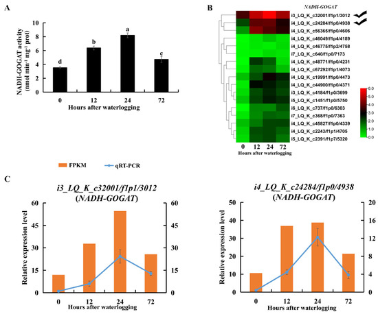 Changes in transcript level and enzyme activity of NADH-GOGAT in KR5 roots under waterlogging stress. (A) changes of the activity of NADH-GOGAT; (B) transcript changes of NADH-GOGATs; (C) RNA-Seq (right vertical axis) and qRT-PCR (left vertical axis) results for transcript changes in two NADH-GOGATs which were highly induced under waterlogging stress. In (A) data are expressed as averages ± SD, n = 3 and significant differences between treatments at p < 0.05 are indicated by different letters over columns (Duncan’s test).