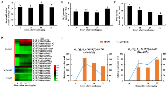 Changes in contents of superoxide anion and hydrogen peroxide and activity of superoxide dismutase (SOD) and expression patterns of SODs in KR5 roots under waterlogging stress. (A) superoxide anion content; (B) H2O2 content; (C) SOD activity; (D) transcript levels of SODs; (E) RNA-Seq (right vertical axis) and qRT-PCR (left vertical axis) results for transcript changes in two Mn-SODs which were highly induced under waterlogging stress. In (A–C) data are expressed as averages ± SD, n = 3 and significant differences between treatments at p < 0.05 are indicated by different letters over columns (Duncan’s test).