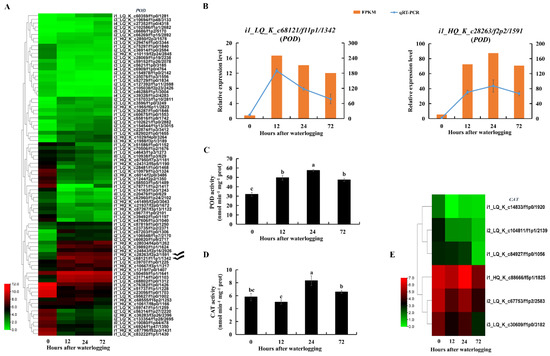 The superoxide anion content was significantly higher in KR5 roots after 24 h of waterlogging than in controls (Figure 10A). SOD catalyzes the dismutation of superoxide anions into H2O2. Total SOD activity was significantly decreased in KR5 roots within 72 h of waterlogging (p < 0.05, Figure 10C). At the transcript level, DEGs encoding manganese SOD (Mn-SOD) were mostly up-regulated, while DEGs encoding copper-zinc and iron SODs were down-regulated under waterlogging stress (Figure 10D). Both RNA-Seq and qRT-PCR results showed that transcript levels of two Mn-SODs (i1_LQ_K_c14090/f1p1/1743 and i2_HQ_K_c5632/f4p6/2696) were highly promoted under waterlogging stress (Figure 10E). POD and CAT can reduce H2O2 into water and oxygen. The H2O2 content decreased slightly after 12 and 24 h of waterlogging and then increased significantly after 72 h of waterlogging compared with levels in controls (p = 8.4 × 10−4, Figure 10B). POD activity increased significantly within 72 h of waterlogging (p < 0.05, Figure 11C). At the transcript level, DEGs encoding POD were mostly down-regulated under waterlogging stress (Figure 11A). However, both RNA-Seq and qRT-PCR results showed that transcript levels of two PODs (i1_LQ_K_c68121/f11p1/1342 and i1_HQ_K_c28263/f2p2/1591) were still highly promoted under waterlogging stress (Figure 11B). CAT activity increased significantly after 24 h of waterlogging (p = 3.2 × 10−3, Figure 11D). At the transcript level, DEGs encoding CAT were down-regulated within 72 h of waterlogging stress compared with levels in controls (Figure 11E). The above results indicated that the three antioxidative enzymes in KR5 roots contributed to the response to waterlogging stress.