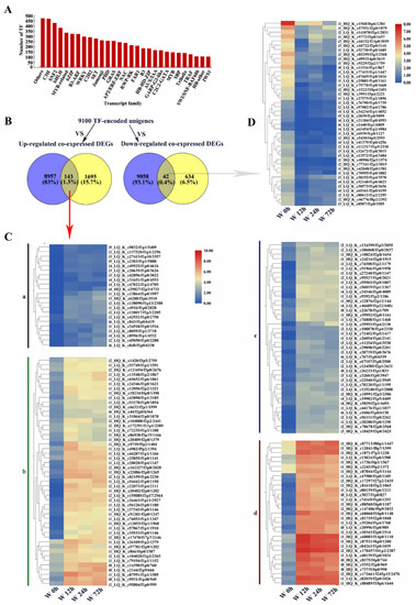Identification of unigenes or DEGs encoding transcript factors (TF). (A) statistics of unigenes encoding TFs; (B) venn diagram of co-expressed DEGs and unigenes encoding TF; (C) a heatmap analysis of up-regulated co-expressed DEGs encoding TFs. According to expression patterns, these up-regulated co-expressed DEGs were clustered to 4 groups (a, b, c, d); (D) a heatmap analysis of down-regulated co-expressed DEGs encoding TFs. W, waterlogging.