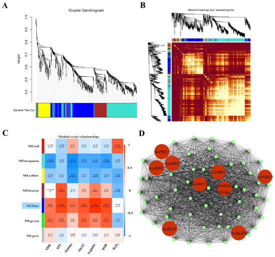 Identification of co-expression network modules. (A) cluster dendrogram of genes included in co-expression module analyses; (B) similarity of selected genes at the network topology level; (C) module-trait associations based on Pearson’s correlation coefficients; (D) gene network of the blue module, which was positively correlated with all selected indexes, except H2O2. Candidate genes within the blue module are highlighted in red and coded for gene descriptors based on annotations.