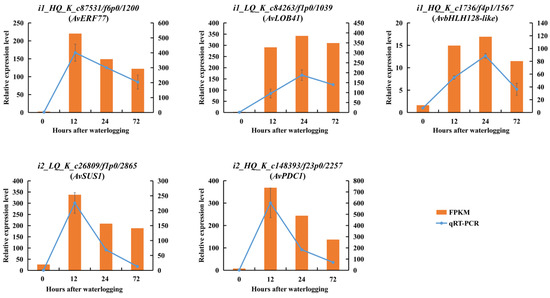 All DEGs were ranked by the sum of FPKM values from 12 independent samples (three replicates, four waterlogging durations). After the deletion of DEGs without annotation, the top DEGs with value above 500 were evaluated by WGCNA. Seven modules containing 40–1070 DEGs each were identified (Figure 13A, Table S7). The similarity of selected genes is shown at the network topology level (Figure 13B). The activity levels of ADH, TPS, AlaAT and POD and the contents of alanine, arginine and H2O2 were used as phenotypic data to calculate the relationships in trait modules (Figure 13C). In the blue module, the correlation coefficients ranged from 0.67 to 0.99, except for H2O2. We selected the top 60 hub genes in the blue module to construct a gene network (Figure 13D, Table S8). In this network, some hub genes involved in glycolysis and fermentation (ADH, PDC and SUS), alanine metabolism (AlaAT), ROS cleavage (POD) and genes encoding TFs (ERF, bHLH and LOB) were highly co-expressed. These results indicated that under the possible control of TFs, several genes associated with carbohydrate and amino acid metabolism and ROS cleavage were significantly upregulated in KR5 roots under waterlogging stress. In addition, the qRT-PCR results showed that expression patterns of the hub genes were similar to those observed in the RNA-Seq data, confirming the validity of the RNA-Seq results (Figure 6A,B, Figure 8D, Figure 11B and Figure 14).