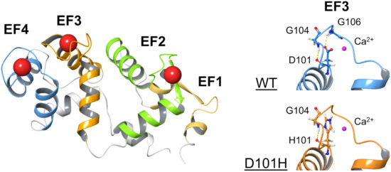 The visual inspection of the MD trajectories allowed us to evaluate the effects of the substitution of D101 (the first Ca2+-coordinating residue of EF3) with the non-conservative histidine on Ca2+-binding. The loss of the highly conserved Asp in position 1 of the Ca2+-binding loop of EF3 implied the lack of a carboxyl group necessary for maintaining the correct pentagonal bi-pyramidal geometry required for Ca2+-coordination. Moreover, the introduction of a His residue in a strongly negatively charged region caused a major distortion of the Ca2+-binding loop. Such distortion caused the progressive loss of Ca2+-coordination by the sidechain of N105 and the backbone carbonyl of S107 (Figure 9B), thus causing the ion to juggle among D103, E112 (and D109, to a lesser extent) until the bidentate E112 was too far to keep Ca2+ in the binding loop, ultimately leading to the dissociation of the ion from EF3 (Figure 9B, Video S1).