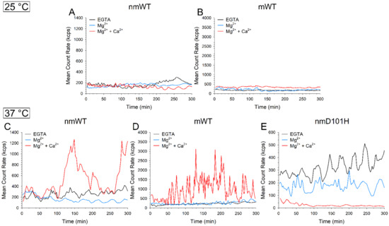 Time evolution over 5 h at 25 °C of the mean count rate of ~8 µM (A) nmWT; and (B) mWT GCAP3 in the presence of 500 µM EGTA (black), 500 µM EGTA and 1 mM Mg2+ (blue), or 1 mM Mg2+ and 500 µM Ca2+ (red). Time evolution over 5 h at 37 °C of the mean count rate of ~8 µM (C) nmWT; (D) mWT; and (E) nmD101H GCAP3 in the same experimental conditions as above.