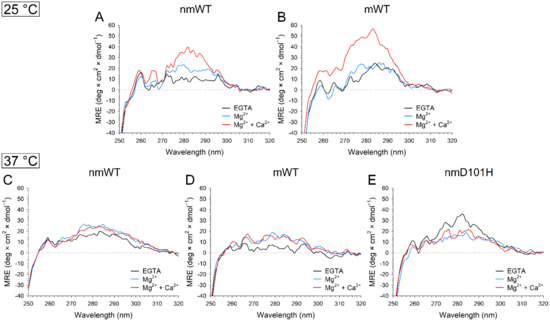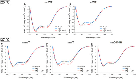 Temperature was found to significantly affect the time-dependence of the secondary structure of both WT variants (Table 2), an exception made for Mg2+-bound nmWT, which displayed no differences in spectral shape but only higher data scattering at 37 °C, a clear temperature-dependent feature shared by all tested variants. In detail, nmWT exhibited higher θ222/θ208 values at 37 °C in the absence of ions (0.84 ± 0.02 vs. 0.91 ± 0.03, Table 2) and upon Ca2+ binding (0.84 ± 0.02 vs. 0.85 ± 0.03, Table 2), while mWT showed a different behavior, as the θ222/θ208 index increased at 37 °C in the apo form (0.83 ± 0.03 vs. 0.85 ± 0.05, Table 2) and decreased in the ion-bound form (0.86 ± 0.03 vs. 0.82 ± 0.05 in the presence of Mg2+ and 0.86 ± 0.03 vs. 0.83 ± 0.03 in the presence of Ca2+, Table 2). The nmD101H variant, on the other hand, showed statistically significant differences with the nmWT only when cation-bound, as shown by the increase in θ222/θ208 from 0.85 ± 0.04 to 0.88 ± 0.03 in the presence of Mg2+, and from 0.85 ± 0.03 to 0.91 ± 0.03 in the presence of Ca2+ (Table 2).