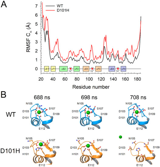 2.8. MD Simulations Provide Atomistic Interpretation of the Effects of the D101H Substitution on nmGCAP3 Flexibility and Ca2+-Binding